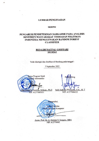 Ghiffari, Rizaldi Naufal (2022) Pengaruh Pendeteksian Sarkasme Pada Analisis Sentimen Masyarakat Terhadap Politikus Indonesia Menggunakan Random Forest Classifier. Other thesis, Universitas Komputer Indonesia.