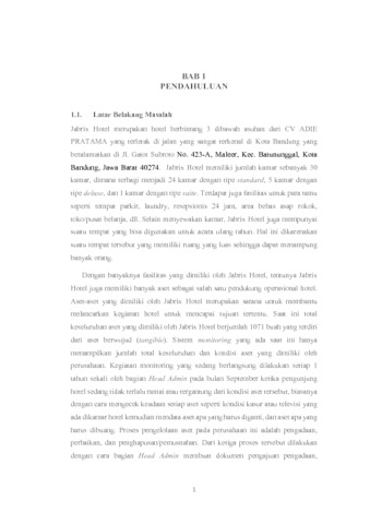 Jabrix Hotel merupakan hotel berbintang 3 dibawah asuhan dari CV ADIE PRATAMA yang terletak di jalan yang sangat terkenal di Kota Bandung. Perusahaan memiliki permasalahan dalam pengelolaan aset, saat ini pengadaan aset pada Jabrix Hotel dilakukan berdasarkan perkiraan terhadap jumlah dan masa kegunaan aset, serta pengamatan terhadap penggunaan aset yang sudah ada yang dilakukan Owner tanpa harus mempertimbangkan kualitas, spesifikasi atau harga yang menjadi bahan pertimbangan dalam pengadaan yang mengakibatkan bagian Head Admin menemukan adanya pembelian aset berwujud yang berlebih dan ketidaksesuaian pengadaan yang dibutuhkan oleh perusahaan sehingga itu otomatis