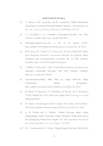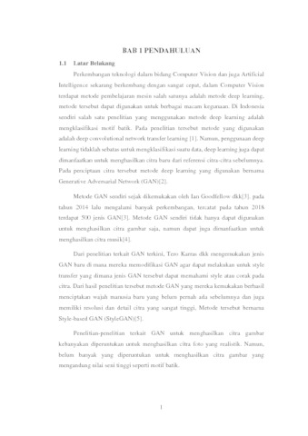 | Uncontrolled Keywords: | Batik, Kecerdasan Buatan, Pembelajaran Mesin, Generative Adversarial Network, Computer Vision, Image Generation |