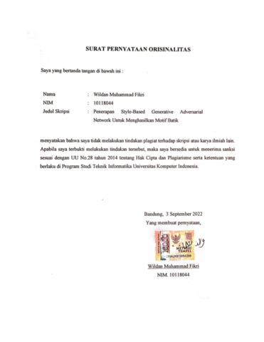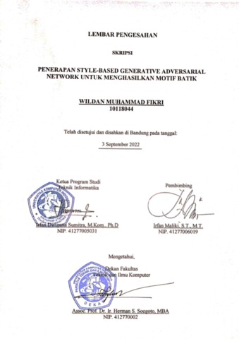Fikri, Wildan Muhammad (2022) Penerapan Style-Based Generative Adversarial Network Untuk Menghasilkan Motif Batik. Other thesis, Universitas Komputer Indonesia.