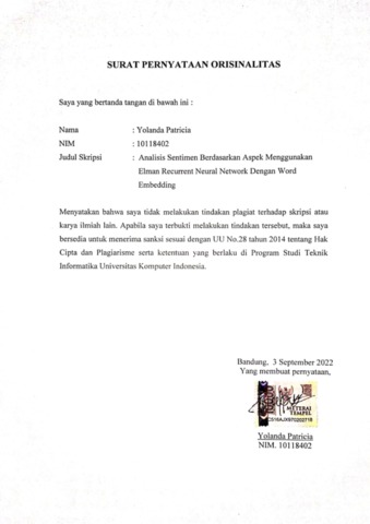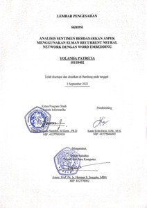 Patricia, Yolanda (2022) Analisis Sentimen Berdasarkan Aspek Menggunakan Elman Recurrent Neural Network Dengan Word Embedding. Other thesis, Universitas Komputer Indonesia.