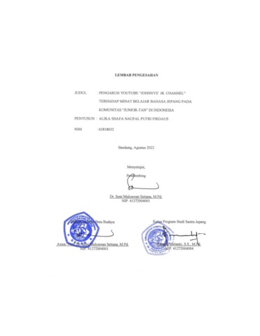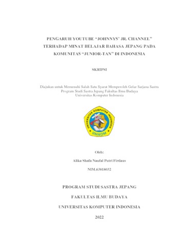 Firdaus, Alika Shafa Naufal Putri (2022) Pengaruh Youtube “Johnnys’ Jr. Channel” Terhadap Minat Belajar Bahasa Jepang Pada Komunitas “Junior-Tan” Di Indonesia. Other thesis, Universitas Komputer Indonesia.