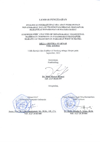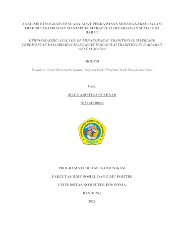 Syahnar, Dilla Aristika (2022) Analisis Etnografi Upacara Adat Perkawinan Minangkabau Dalam Tradisi Pasambahan Manjapuik Marapulai Di Pariaman, Sumatera Barat. Other thesis, Universitas Komputer Indonesia.