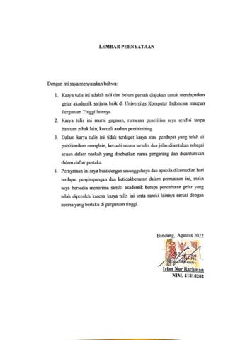 UNIKOM_IRFAN NUR RACHMAN_LEMBAR PERYATAAN.pdf - Published Version