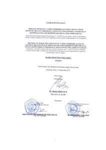 Penelitian ini bertujuan untuk mengetahui bagaimana Peranan Humas PT. TASPEN (Persero) KCUMelalui Program Tanggung Jawab Sosial Lingkungan Kemitraan (TJSL) Dalam Mempertahankan Citra Perusahaan Untuk menjawab masalah diatas maka peneliti mengangkat Sub Fokus penelitian, yaitu perencanaan, pelaksanaan dan evaluasi. Penelitian ini adalah kualitatif dengan pendekatan desktiptif untuk mengungkap Peranan Humas PT. TASPEN (Persero) Kantor Cabang Umum Bandung yang dalam pelaksanaannya dilaksanakan oleh divisi HC & GA. Informan dalam penelitian ini adalah Kepala divisi, dan Staff divisi HC & GA PT. TASPEN KCU Bandung. Teknik pengumpulan data dilakukan dengan wawancara mendalam, observasi, studi pustaka, dokumentasi dan internet searching. Teknik analisa data menggunakan model interaktif yang kemudian dilakukan teknik pemeriksaan keabsahan data. Hasil penelitian menunjukan bahwa dalam hal perencanaan, yaitu dengan melakukan pengenalan program bagi Aparatur Sipil Negara (ASN) dan juga memberitahukan apa saja syarat menjadi mitra binaan setelahnya barulah memproyeksi data yang masuk , diseleksi dan dilihat prioritasnya, pelaksanaan dengan pertemuan dengan para mitra binaan dan pelaksanaan seminar disetiap akhir tahun, tahap dilakukan setiap satu bulan sekali untuk peninjauan kelancaran pembayaran yang dilakukan oleh mitra binaan dan juga evaluasi setiap enam bulan sekali untuk meninjau perkembangan usaha yang dimiliki mitra binaan yang bertujuan mengetahui bagaimana dampak yang terjadi setelah menjadi mitra binaan. Berdasarkan hasil penelitian, disimpulkan dalam tahap perencanaan yaitu pengenalan program sudah berjalan dengan baik karena menggunakan cara yang membuat para ASN memberi perhatian terhadap program ini, lalu pada tahap pelaksanaan sudah sesuai dengan kebutuhan mitra namun untuk penerimaannya masih dibilang sedikit, dan untuk tahap evaluasi sangatlah penting dilaksanakan karena menjadi tolak ukur dari keberhasilan program TJSL Kemitraan ini. Saran yaitu diharapkan dalam penerimaan mitra binaannya lebih diperbanyak lagi dan juga untuk tahap evaluasi diharapkan divisi HC & GA memberikan sarana bagi mitra binaan untuk memberikan masukan evaluasi terhadap program yang dijalankan karena se efektif apapun program apabila hanya dinilai dari satu pihak tidak lah bisa dianggap valid.