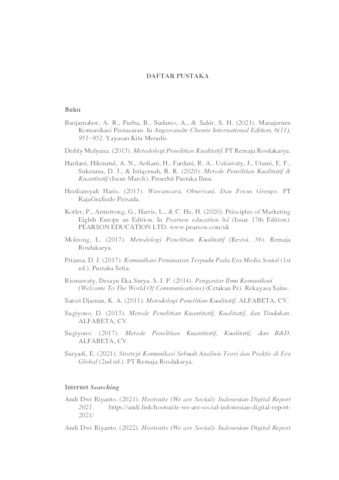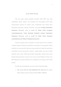Penelitian ini bermaksud untuk mengetahui dan mendeskripsikan Strategi Komunikasi Pemasaran Electronic word of mouth Di Media Sosial Instagram @marthabeauty.bar Dalam Peningkatan Konsumen adalah mengetahui dimensi Electronic word of mouth Intensitas, Valensi Opini, dan Konten. Metode yang digunakan dalam penelitian ini adalah pendekatan kualitatif dengan metode studi deskriptif. Dengan teknik pengumpulan data melalui studi literatur, skripsi penelitian terdahulu, internet searching serta studi lapangan wawancara mendalam, observasi non partisipan dan dokumentasi. Melalui teknik purposive sampling diperoleh enam informan yaitu tiga informan kunci serta tiga informan pendukung Hasil dari penelitian ini menunjukkan bahwa dalam upaya peningkatan konsumen Martha Beauty Bar telah melakukan tiga dimensi Electronic word of mouth sebagai strategi komunikasi pemasaran yaitu intensitas, valensi opini, dan konten. Intensitas Electronic word of mouth di media sosial instagram @marthabeauty.bar terbilang intens karena konsumen sebagian besar intens mengakses informasi, berinteraksi serta memberikan ulasan, instagram @marthabeauty bar intens berinteraksi menggunakan fitur instagram question box. Valensi Opini Electronic word of mouth terdapat komentar positif dan negatif dari konsumen/followersnya, namun komentar positif lebih banyak didapatkan, rekomendasi dari influencer/selebgram dan konsumen sangat memengaruhi peningkatan konsumen. Konten Electronic word of mouth terdapat informasi positif serta negatif mengenai harga, kualitas dan pelayanan yang diberikan oleh konsumen, serta beberapa konten instagram @marthabeauty.bar dapat mempersuasif serta memengaruhi peningkatan konsumen seperti konten repost story dari konsumen dan influencer/selebgram, konten “Kata Mereka Tentang Martha Beauty Bar”, question box, dan hasil treatment. Kesimpulan penelitian, Martha Beauty Bar telah berhasil melakukan Strategi Komunikasi Pemasaran Electronic word of mouth di Media Sosial Instagram @marthabeauty.bar, dimana hal tersebut dapat dilihat dari peningkatan followers, peningkatan cabang serta pertumbuhan grafik jumlah konsumen dari bulan januari-juli 2022 dari ketiga cabang. Saran penelitian, mengembangkan media sosial lainnya seperti tiktok dan website, membuat company profile agar dapat dimanfaatkan untuk pemasaran serta menarik stakeholdaer ekstrernal terutama investor, dan sebaiknya admin instagram dan whatsapp berbeda agar fokusnya tidak terbagi.