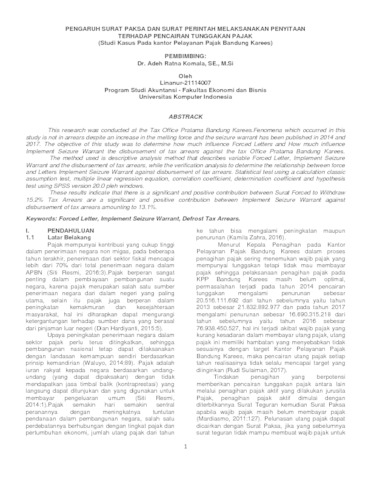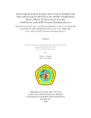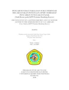 Linanur, Linanur (2018) Pengaruh Surat Paksa Dan Surat Perintah melaksanakan Penyitaan (SPMP) terhadap Pencairan Tunggkan Pajak (Studi Kasus pada KPP Pratama Bandung Karees). Other thesis, Universitas Komputer Indonesia.