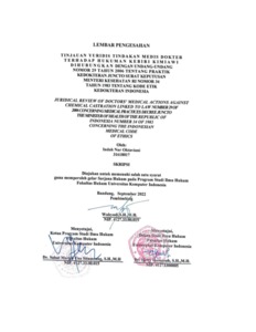 Penelitian dilakukan secara deskriptif analisis, yaitu penggambaran fakta yang dihubungkan dengan bahan hukum yang bersifat kepustakaan dengan menggunakan metode pendekatan yuridis normatif, dimana peraturan perundang-undangan, buku-buku, jurnal dan sumber lain yang dianggap relevan dengan kajian menjadi dasar dalam penelitian. Analisis dilakukan secara yuridis kualitatif, yang memperhatikan hierarki peraturan perundang-undangan. Tindakan medis dokter harus berdasarkan dengan standar operasional prosedur dan diatur dalam Pasal 44 Undang-Undang Nomor 29 Tahun 2006 Tentang Praktik Kedokteran. Begitu pula dengan tindakan medis kebiri kimiawi yang merupakan kewenangan dokter. Tanggung jawab dokter dalam tindakan medis kebiri kimiawi ini dalam praktiknya menimbulkan pertentangan dikalangan para dokter karena bertentangan dengan Sumpah Hippocrates dan juga Kode Etik Kedokteran Indonesia yang berasaskan tidak menyakiti atau non maleficence. Akan tetapi, dokter harus tetap tunduk terhadap perintah dari putusan pengadilan sehingga dokter dalam memberikan tindakan profesional demi hukum atau undang-undang ini mempunyai dasar argumen etis yang kuat, sehingga dalam hal ini dokter yang bertindak atas nama keadilan. Seharusnya pemerintah memberikan kebijakan kepada dokter untuk melaksanakan kebiri kimiawi sesuai dengan putusan pengadilan maka kode etik kedokteran bisa dikesampingkan dan dinilai tidak mencederai Sumpah Hippocrates dan juga Kode Etik Kedokteran.