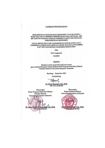 Anggraeni, Putri (2022) Perlindungan Hukum Bagi Konsumen Atas Klausula Baku Dalam E-Commerce Dihubungkan Dalam Pasal 1320 Bw Juncto Undang-Undang Nomor 8 Tahun 1999 Tentang Perlindungan Konsumen. Other thesis, Universitas Komputer Indonesia.