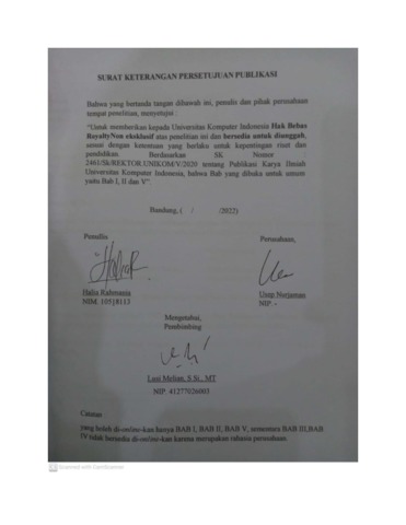 UNIKOM_Halia Rahmania_Lampiran Lembar Persetujuan Publikasi.pdf - Published Version