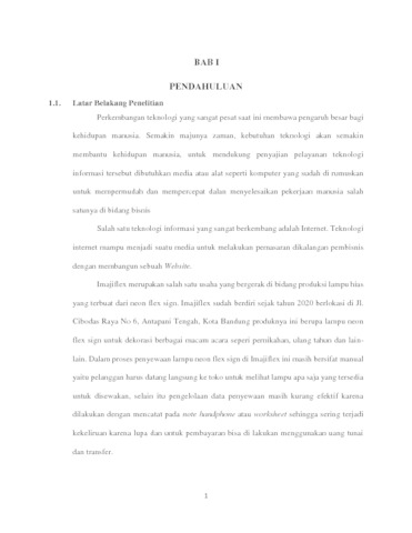 Imajiflex merupakan sebuah usaha yang bergerak dibidang dekorasi lampu hias neon flex sign, Imajiflex menyewakan berbagai macam neon flex sign untuk berbagai macam kebutuhan acara yang beralamat di Bandung. Didalam menyediakan layanan penyewaan lampu neon flex sign ini Imajiflex masih kurang maksimal dikarenakan pelanggan harus datang langsung ke lokasi perusahaan untuk melihat lampu apa saja yang tersedia untuk disewakan. Selain itu dalam pengelolaan data atau laporan penyewaaan yang dilakukan masih belum efektif. Oleh karena itu, untuk meningkatkan pelayanan kepada pelanggan dan pengelolaan data perusahaan yang lebih baik dibuatlah penelitian ini yang bertujuan untuk menghasilkan sistem informasi yang bisa membantu dalam pelayanan kepada pelanggan dan memberikan kemudahan untuk pengelolaan penyewaan kendaraan mulai dari proses pendaftaran sampai laporan penyewaan. Karena dengan adanya sistem informasi yang dibuat ini pelanggan bisa mengetahui informasi ketersediaan barang yang disewakan secara online dan membantu dalam pengelolaan data serta pembuatan laporan penyewaan.