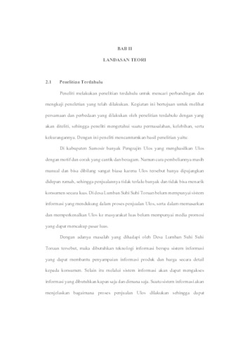 Metode pendekatan yang digunakan peneliti adalah metode deskriftif, dan metode pengembangan sistemnya yaitu menggunakan metode prototype. Metode prototype user dan analis dapat berinteraksi secara langsung dalam proses pembuatan sistem perancangannya. Dengan beberapa kendala yang ada di pertenunan sutera alam majalaya, hal tersebut peneliti membuat sebuah sistem informasi penjualan kain tenun tradisional adat batak berbasis website untuk mempermudah pimpinan, sekertaris, dan manajer produksi agar lebih terkomputerisasi. Website ini memiliki keterbatasan dalam proses pengembangannya, mengahrapkan sistem informasi penjualan ini dapat di kembangkan sehingga dipergunakaan sebaik mungkin. Selain itu dalam proses pembayaran seharusnya dapat dilakukan secara online juga, yang mampu lebih cepat dalam melakukan transaksi penjualan.