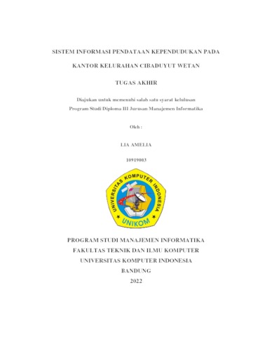 Amelia, Lia (2022) Sistem Informasi Pendataan Kependudukan Pada Kantor Kelurahan Cibaduyut Wetan. Diploma thesis, Universitas Komputer Indonesia.