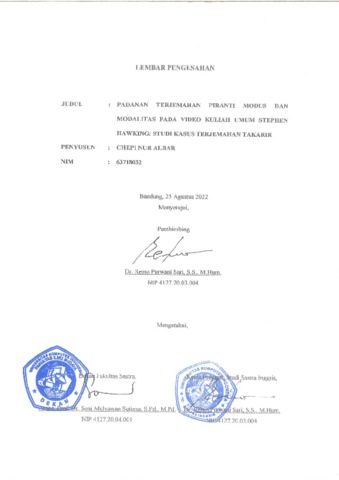 Albar, Chepi Nur (2022) Padanan Terjemahan Piranti Modus dan Modalitas pada Video Kuliah Umum Stephen Hawking: Studi Kasus Terjemahan Takarir. Other thesis, Universitas Komputer Indonesia.