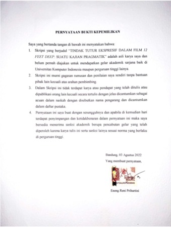 Prihartini, Eneng Reni (2022) Tindak Tutur Ekspresif Dalam Film 12 Feet Deep: Suatu Kajian Pragmatik. Other thesis, Universitas Komputer Indonesia.