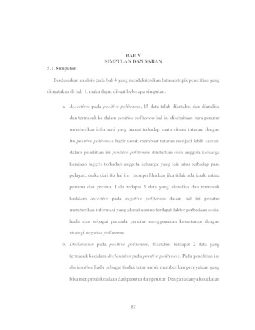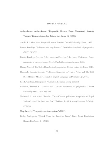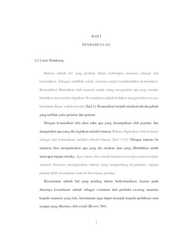 Penelitian berjudul “Strategi kesantunan dalam ujaran pada serial televisi Netflix The Crown musim ke 1” memiliki tujuan untuk mendeskripsikan dan menganalisis bentuk strategi kesantunan serta bentuk tindak tutur dalam sebuah tuturan yang terdapat pada dialog antar pemeran dalam serial televisi Netflix The Crown pada musim ke 1. Pada penelitian ini, data dianalisis menggunakan teori kesantunan Brown dan Levinson (1987) untuk menganalisis bentuk stategi kesantunannya, sedangkan teori ilokusi oleh J Searle (1979) digunakan untuk menganalisis bentuk tindak tutur yang digunakan dalam suatu tuturan yang terdapat pada dialog serial televisi tersebut. Penelitian ini menggunakan metode kualitatif deskriptif untuk mendeskripsikan analisis secara mendalam. Data penelitian ini bersumber dari serial televisi yang dibuat oleh suatu perusahaan penyedia layanan menonton film secara daring yang bernama Netflix yang bergenre drama sejarah. Dari penelitian ini, hasil menujukkan bahwa terdapat dua kesantunan yang ditemukan yaitu positive politeness dengan strategi kesantunan meliputi Presuppose/raise/assert common ground, Exaggerate (Interest, Approval, Sympathy with Hearer), notice, attend to Hearer (His interest, wants, needs, goods), be optimistic, assert or presuppose Speaker’s knowledge of and concern for Hearer’s wants dan negative politeness yang meliputi apologize, conventionally Indirect, give difference dan minimize the imposition. Lalu dalam penelitian ini, ditemukan empat bentuk tindak tutur yang membangun tuturan dengan bentuk positive politeness yaitu assertives, declaration, expressives dan directives, sedangkan dalam bentuk negative politeness ditemukan empat bentuk tindak tutur yang membangun tuturan yang ditemukan yaitu expressives, assertives, directives dan commisives. Hasil penelitian menunjukkan bahwasanya dalam serial televisi ini terdapat aspek sosial yang mendasari penutur menggunakan kesantunan positive atau negative politeness untuk berkomunikasi dengan petutur. Penelitian ini dapat membantu pembaca untuk memahami lebih jauh tentang kesantunan yang terdapat di masyarakat terutama dalam kelompok masyarakat formal.
