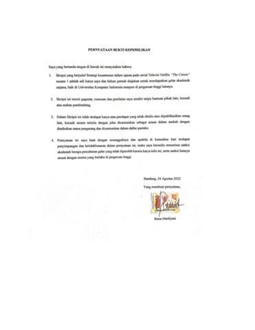 Mardiyani, Rima (2022) Strategi Kesantunan Dalam Ujaran Pada Serial Televisi Netflix “The Crown” Musim 1. Other thesis, Universitas Komputer Indonesia.