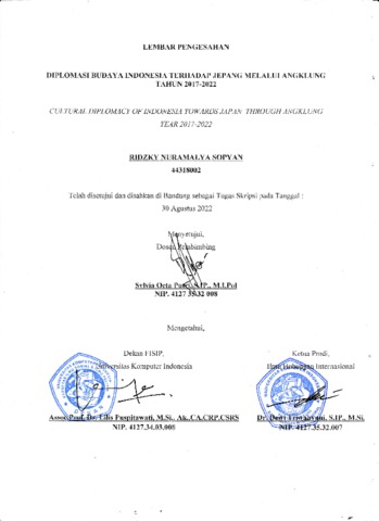 Sopyan, Ridzky Nuramalya (2022) Diplomasi Budaya Indonesia Terhadap Jepang Melalui Angklung Tahun 2017-2022. Other thesis, Universitas Komputer Indonesia.