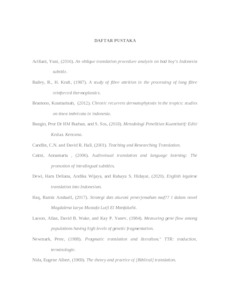 Penelitian ini membahas mengenai analisis prosedur penerjemahan takarir berbahasa Indonesia pada anime Hyouka. penelitian ini bertujuan untuk mengidentifikasi, mengklasifikasi, dan menganalisa prosedur terjemahan transposisi dan modulasi pada takarir anime Hyouka yang diguanakan penerjemah dalam menerjemahkan takarir anime ini. Metode penelitan yang digunakan penulis pada penelitian ini adalah studi pustaka, sedangkan metode sampling digunakan sebagai metode pengumpulan data lalu metode deskriptif kualitatif digunakan untuk menganalisa hasi temuan. Total Hasil temuan prosedur terjemahan transposisi dengan berjumlah 17 dan modulasi berjumlah 33 didalam takarir bahasa Indonesia pada anime Hyouka. total Hasil temuan prosedur terjemahan transposisi dengan berjumlah 17 dan modulasi berjumlah 33 didalam takarir bahasa Indonesia pada anime Hyouka. Dengan hasil temuan tersebut dapat diketahui bahwa prosedur penerjemahan modulasi lebih dominan dari penelitian ini. Dapat disimpulkan bahwa penerjemah lebih cenderung memilih menggunakan prosedur penerjemahan modulasi saat melakukkan proses terjemahan agar TSa lebih dapat diterima pada BSa.