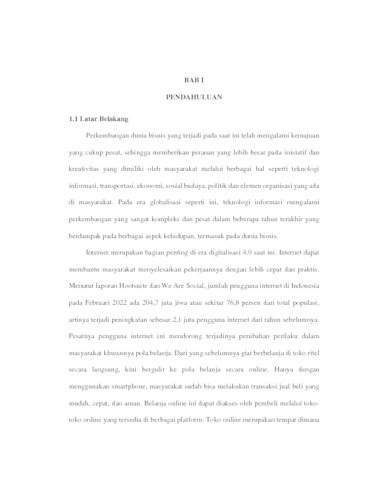 Perkembangan dunia bisnis yang terjadi pada saat ini telah mengalami kemajuan yang cukup pesat, sehingga memberikan peranan yang lebih besar pada inisiatif dan kreativitas yang dimiliki oleh masyarakat melalui berbagai hal seperti teknologi informasi, transportasi, ekonomi, sosial budaya, politik dan elemen organisasi yang ada di masyarakat. Pada era globalisasi seperti ini, teknologi informasi mengalami perkembangan yang sangat kompleks dan pesat dalam beberapa tahun terakhir yang berdampak pada berbagai aspek kehidupan, termasuk pada dunia bisnis. Internet merupakan bagian penting di era digitalisasi 4.0 saat ini. Internet dapat membantu masyarakat menyelesaikan pekerjaannya dengan lebih cepat dan praktis. Menurut laporan Hootsuite dan We Are Social, jumlah pengguna internet di Indonesia pada Februari 2022 ada 204,7 juta jiwa atau sekitar 76,8 persen dari total populasi, artinya terjadi peningkatan sebesar 2,1 juta pengguna internet dari tahun sebelumnya. Pesatnya pengguna internet ini mendorong terjadinya perubahan perilaku dalam masyarakat khususnya pola belanja. Dari yang sebelumnya giat berbelanja di toko ritel secara langsung, kini bergulir ke pola belanja secara online. Hanya dengan menggunakan smartphone, masyarakat sudah bisa melakukan transaksi jual beli yang mudah, cepat, dan aman. Belanja online ini dapat diakses oleh pembeli melalui toko-toko online yang tersedia di berbagai platform.