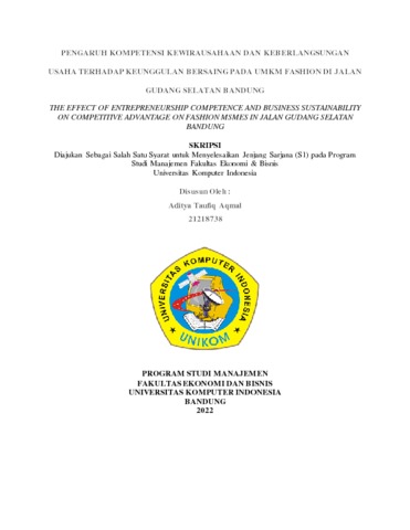 Persaingan dunia usaha di Indonesia semakin ketat, setiap perusahaan bersaing untuk menarik pelanggan dan mempertahankan eksistensinya di pasar. Penurunan pertumbuhan industri tekstil dan pakaian jadi di tahun 2020 -2021 terjadi di sepanjang tahun 2020 dari Badan Pusat Statistik. Indusrtri kreatif pada bidang Fashion di Jalan Gudang Selatan adalah salah satu tempat yang menarik perhatian remaja di Bandung. Penelitian ini bertujuan untuk mengetahui pengaruh Kompetensi Kewirausahaan dan Keberlangsungan Usaha terhadap Keunggulan Bersaing para pelaku Usaha UMKM di Jalan Gudang Selatan. Indentifikasi masalah penelitian ini berada pada harga produk, pengetahuan kewirausahaan, dan ketergantungan pada pihak lain sejak mendirikan usahanya. Metode penelitian yang peneliti ambil adalah metode analisis deskriptif dan verifikatif. Dengan 35 responden untuk menjawab kuisioner yang peneliti berikan dengan acuan indicator-indikator variable dependen dan independent.