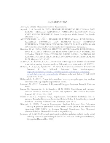 | Uncontrolled Keywords: | Kepercayaan, Kualitas Informasi, Kualitas Pelayanan, Keputusan Pembelian. |