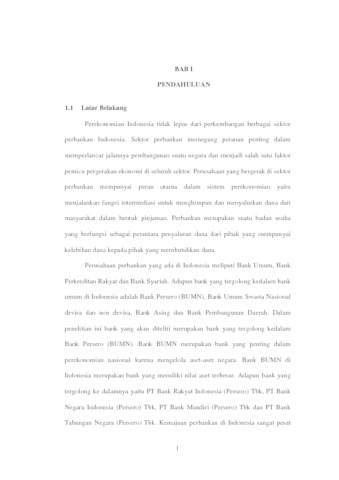 Perekonomian Indonesia tidak lepas dari perkembangan berbagai sektor perbankan Indonesia. Sektor perbankan memegang peranan penting dalam memperlancar jalannya pembangunan suatu negara dan menjadi salah satu faktor pemicu pergerakan ekonomi di seluruh sektor. Perusahaan yang bergerak di sektor perbankan mempunyai peran utama dalam sistem perekonomian yaitu menjalankan fungsi intermediasi untuk menghimpun dan menyalurkan dana dari masyarakat dalam bentuk pinjaman. Perbankan merupakan suatu badan usaha yang berfungsi sebagai perantara penyaluran dana dari pihak yang mempunyai kelebihan dana kepada pihak yang membutuhkan dana.
