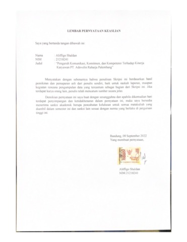 Shaldan, Aliffigo (2022) Pengaruh Komunikasi, Komitmen, Dan Kompetensi Terhadap Kinerja Karyawan Pt. Adovelin Raharja Palembang. Other thesis, Universitas Komputer Indonesia.