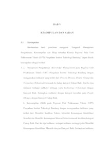 Tujuan dari penelitian ini menentukan manajemen pengetahuan, keterampilan, sikap dan kinerja pegawai serta untuk mendapati pengaruh dari manajemen pengetahuan, keterampilan, dan sikap yang sama terhadap kinerja dan pegawai secara parsial maupun simultan. Metode yang digunakan ialah metode deskriptif dan verifikatif. Sampling dilakukan dengan sampling jenuh pegawai Unit Pelaksanaan Teknis (UPT) Pengadaan Institut Teknologi Bandung. Pengumpulan data dilakukan melalui observasi, wawancara dan angket. Uji statistik yang digunakan adalah asumsi klasik, analisis regresi linier berganda, analisis koefisien korelasi, koefisien determinasi dan uji hipotesis menggunakan uji-t (parsial) dan uji-f (simultan).