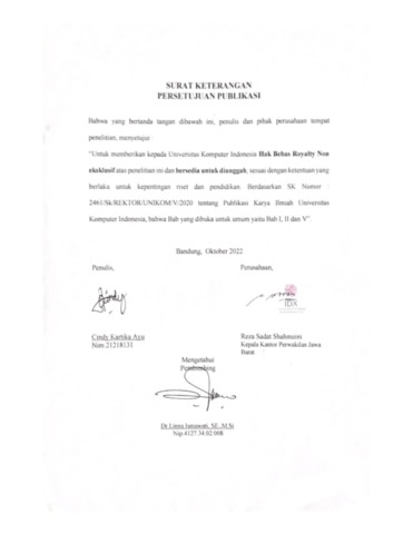 UNIKOM_CINDY KARTIKA AYU_ SURAT KETERANGAN PERSETUJUAN PUBLIKASI.pdf - Published Version