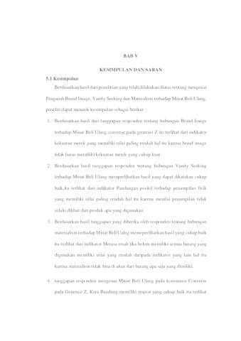 Penelitian ini menghasilkan jika variable brand image mempunyai pengaruh terhadap minat beli ulang, semeentara pada variable vanity seeking secara parsial memiliki pengaruh tehadap minat beli ulang, tidak hanya itu variable materialism juga memiliki pengaruh positif siginifikan, secara kesuluran setiap variable yaitu brand image,vanity seeking dan materialsm secara bersama – sama(simultan) memiliki pengaruh yang siginifikan terhadap minat beli ulang