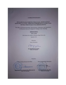 Penelitian ini bertujuan untuk mengetahui tanggapan responden mengenai Karakteristik Wirausaha, Motivasi dan Kemampuan Usaha dan Keberhasilan Usaha pada Sentra Percetakan Pagarsih Bandung, serta mengetahui Pengaruh Karakteristik Wirausaha, Motivasi, Kemampuan Usaha dan Keberhasilan Usaha secara simultan maupun parsial. Penelitian ini menggunakan metode deskriptif dan verifikatif dengan pendektan kuantitatif dengan pengambilan sampel yaitu sampel jenuh sebanyak 63 responden. Pengambilan data yang dilakukan melalui wawancara dan penyebaran kuesioner yang diolah menggunakan program SPSS V22.