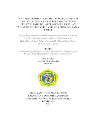 Salsabilla, Ivanka Fasha (2022) Pengaruh Komunikasi Organisasi, Motivasi, Dan Lingkungan Kerja Terhadap Kinerja Pegawai Pada Balai Pengelolaan Jalan Wilayah Iii – Dinas Bina Marga Provinsi Jawa Barat. Other thesis, Universitas Komputer Indonesia.
