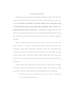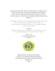Tujuan penelitian ini bertujuan menentukan Komunikasi Organisasi, Motivasi, Lingkungan kerja, dan kinerja Pegawai serta untuk mengetahui pengaruh dari Komunikasi Organisasi, Motivasi, Lingkungan Kerja yang sama terhadap Kinerja Pegawai secara parsial maupun simultan. Metode yang digunakan adalah metode deskriptif dan verifikatif. Sampling yang dilakukan dengan random sampling pada Balai Pengelolaan Jalan Wilayah III- Dinas Bina Marga Provinsi Jawa Barat. Data dikumpulkan melalui observasi, wawancara dan kuesioner. Uji statistik yang digunakan adalah asumsi klasik, analisis regresi linier berganda, analisis koefisien korelasi, koefisien determinasi dan pengujian hipotesis menggunakan Uji T (parsial) dan Uji F (simultan). Berdasarkan hasil analisis deskriptif yang dilakukan, penulis mendapatkan hasil bahwa variabel Komunikasi Organisasi, Motivasi, Lingkungan kerja, dan kinerja Pegawai dinilai baik. Sementara hasil penelitian menunjukkan bahwa Komunikasi Organisasi, Motivasi, dan Lingkungan kerja berpengaruh terhadap kinerja Pegawai Balai Pengelolaan Jalan Wilayah III- Dinas Bina Marga Provinsi Jawa Barat. Lalu, Komunikasi Organisasi, Motivasi, Lingkungan kerja, dan Kinerja Pegawai secara simultan berpengaruh terhadap Kinerja Pegawai. Balai Pengelolaan Jalan Wilayah III- Dinas Bina Marga Provinsi Jawa Barat.