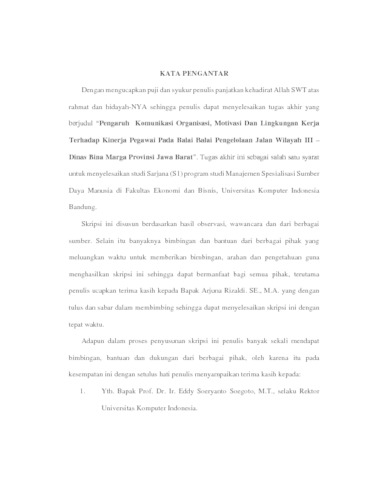 | Uncontrolled Keywords: | Komunikasi Organisasi, Motivasi, Lingkungan Kerja, Kinerja Pegawai |