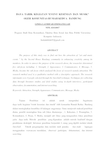 Tujuan Penelitian ini adalah untuk mengetahui bagaimana Daya Tarik Kegiatan “Event Kesenian dan Musik” Oleh Komunitas Rumah Kedua Bandung. Guna menjawab maksud penelitian diatas, peneliti menetapkan lima sub fokus komunikasi diantaranya : 1. Kekuatan, 2. Penampilan, 3. Komunikator, 4. Pesan, 5. Media, menjadi sub fokus yang menganalisis fokus penelitian yaitu daya tarik. Pada penelitian ini menggunakan metode tipe penelitian kualitatif dengan pendekatan studi deskriptif. Informan yang dipilih melalui dan menggunakan Snowball, sehingga dapat dipilih dan ditetapkan satu informan kunci dan tiga informan pendukung. Teknik pengumpulan data yang dilakukan dengan cara studi pustaka, studi lapangan dengan melakukan observasi dan wawancara. Teknik analisis data yang digunakan yaitu pengumpulan data, reduksi data, penyajian data, penarikan kesimpulan.