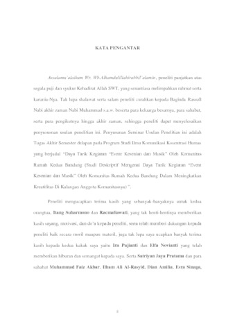 Kesimpulan dari Daya Tarik Kegiatan “Event Kesenian dan Musik” Oleh Komunitas Rumah Kedua Bandung adalah dengan menggunakan rasa kekeluargaan dan solidaritas yang menjadi landasan kekuatan serta penampilan yang menyesuaikan kepada tema dalam sebuah acara agar para audiens dapat menikmati dalam kegiatan event tersbut, komunikator yang melatarinya adalah dorongan untuk menjadi pusat perhatian para audiens yang menentukan jalannya acara dalam meningkatkan kreatifitas dengan pesan yang mudah dipahami dan dimengerti, serta media sosial dalam penyebaran informasi. Saran yaitu semua visi dan misi terus terlaksana dengan baik agar keinginan dan tujuan komunitas itu semakin tercapai.