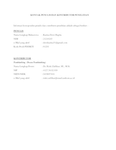 UNIKOM_KARINA DEWI HAPITA_LEMBAR KONTAK PENULIS DAN KONTRIBUTOR.pdf - Published Version