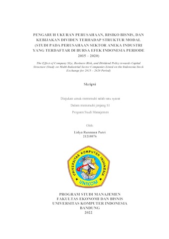 Putri, Lidya Rusmana (2022) Pengaruh Ukuran Perusahaan, Risiko Bisnis Dan Kebijakan Dividen Terhadap Struktur Modal (Studi Pada Perusahaan Sektor Aneka Industri Yang Terdaftar Di Bursa Efek Indonesia Periode 2015-2020). Other thesis, Universitas Komputer Indonesia.