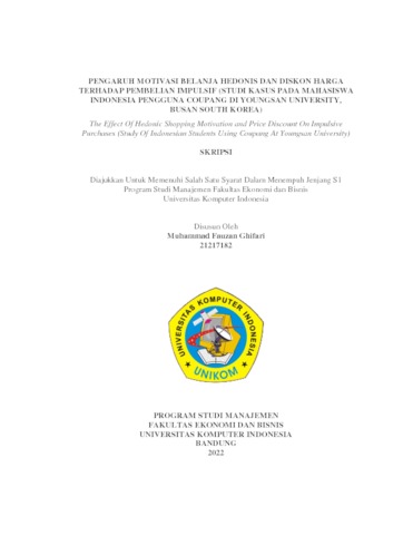Ghifari, Muhammad Fauzan (2022) Pengaruh Motivasi Belanja Hedonis Dan Diskon Harga Terhadap Pembelian Impulsif (Studi Kasus Pada Mahasiswa Indonesia Pengguna Coupang Di Youngsan University, Busan South Korea). Other thesis, Universitas Komputer Indonesia.