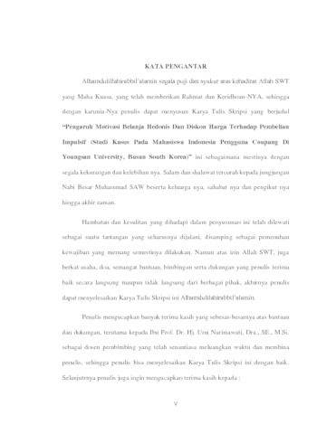 Tujuan penelitian ini bertujuan untuk mengetahui Pengaruh Motivasi Belanja Hedonis dan Diskon Harga terhadap Pembelian Impulsif (Studi Kasus Pada Mahasiswa Indonesia Pengguna Coupang di Youngsan University, Busan South Korea). Didalam penelitian ini terdapat perbedaan hasil penelitian terdahulu sehingga diperlukan pembaruan hasil perkembangan saat ini. Sehingga terdapat perbedaan hasil antara teori dan fakta dilapangan yang mempengaruhi keputusan pembelian impulsif.
