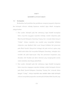 Penelitian ini bertujuan untuk mengetahui pengaruh religiusitas dan kelompokreferensi terhadap keputusan menabung pada pengaruh religiusitas dan kelompok referensi terhadap keputusan menabung di Bank Syariah Indonesia KCP Sumedang Tanjungsari. Penelitian ini menggunakan kuantitatif dengan pengambilan sampel menggunakan teknik slovin sebanyak 100 responden. Pengambilan data yang dilakukan melalui wawancara dan pengumpulan kuesioner. Metode dalam penelitian ini menggunakan analisis deskriptif dan verifikatif yang diolah menggunakan program SPSS V23. Dilihat dari analisis deskriptif dapat dilihat religiusitas dan kelompok referensi terhadap keputusan menabung termasuk dalam kategori baik, lalu hasil yangdi dapat dari penelitian setelah melalui analisis verifikatif yaitu uji-F dan uji- T menyatakan bahwa terdapat pengaruh signifikan religiusitas dan kelompok referensi secara parsial lalu hasil uji-f terdapat pengaruh signifikan antara religiusitas dan kelompok referensi terhadap keputusan menabung secara simultan.