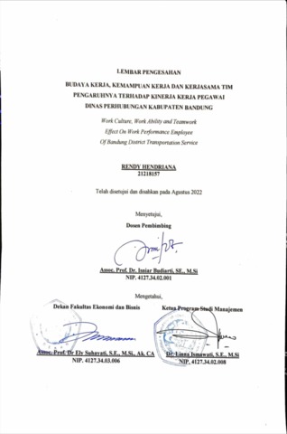 Hendriana, Rendy (2022) Budaya Kerja, Kemampuan Kerja Dan Kerjasama Tim Pengaruhnya Terhadap Kinerja Kerja Pegawai Dinas Perhubungan Kabupaten Bandung. Other thesis, Universitas Komputer Indonesia.