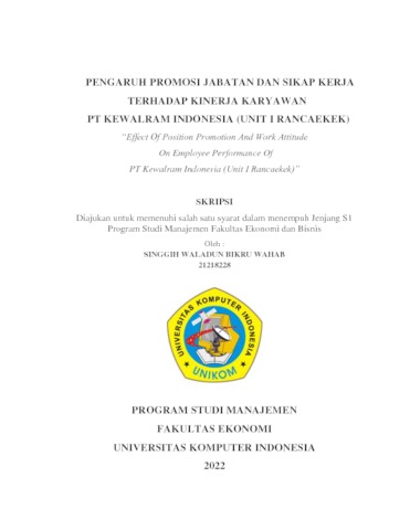 Wahab, Singgih Waladun Bikru (2022) Pengaruh Promosi Jabatan Dan Sikap Kerja Terhadap Kinerja Karyawan Pt Kewalram Indonesia (Unit I Rancaekek). Other thesis, Universitas Komputer Indonesia.