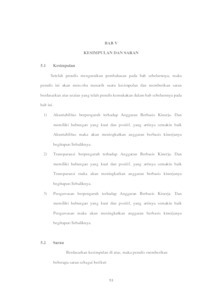 Hasil penelitian ini menunjukan bahwa Akuntabilitas, Transparansi, dan Pengawasan berpengaruh positif signifikan terhadap Anggaran Berbasis Kinerja pada Badan Keuangan dan Aset Daerah Kabupaten Bandung.