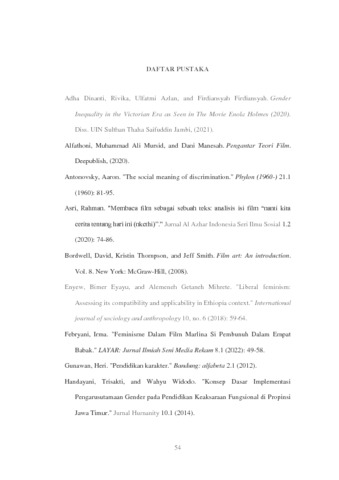 Penelitian berjudul “Diskriminasi terhadap Perempuan pada Film Enola Holmes” ini bertujuan untuk menganalisis dan mendeskripsikan serta mengidentifikasi factor dan jenis diskriminasi serta cara mengatasinya dalam film berjudul ‘Enola Holmes’. Faktor diskriminasi yang terdapat pada film ini diidentifikasi menggunakan konsep diskriminasi gender yang digagas oleh Beauvoir dan kajian film. Penelitian ini menggunakan metode deskriptif kualitatif untuk menggambarkan analisis fenomena secara menyeluruh dengan teori feminisme. Data diperoleh melalui hasil tangkapan layar pada film yang menunjukkan adegan dengan kriteria yang telah ditentukan dalam film ‘Enola Holmes’. Hasil penelitian menunjukkan bahwa diskriminasi pada film ‘Enola Holmes’ dipaparkan melalui adegan-adegan yang memperlihatkan diskriminasi gender melalui dialog yang hadir. Diskriminasi tersebut terjadi akibat beberapa faktor, yaitu faktor kepercayaan masyarakat, mitos, dan historis. Bentuk-bentuk diskriminasi gender yang dialami Enola meliputi ketidakbebasannya dalam menjalani kehidupannya sebagai seorang perempuan karena ia dipaksa untuk mengikuti sekolah untuk menjadi ‘perempuan’, diragukan dalam kemampuannya sebagai seorang detektif, dianggap tidak memenuhi standar kecantikan, serta dipaksa untuk patuh. Pada penelitian ini juga, beberapa cara Enola melawan diskriminasi ditunjukkan bahwa perempuan juga memiliki hak untuk mendapatkan kebebasan dalam pendidikan, rasa aman bagi setiap gender, serta peluang politik yang setara. Penelitian ini juga diharapkan dapat menjadi acuan untuk penelitian selanjutnya terutama mengenai edukasi diskriminasi terhadap perempuan.