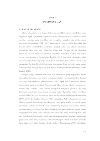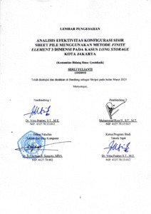 Jakarta sebagai ibu kota Negara Indonesia dengan tingkat pertumbuhan penduduk, ekonomi, dan sosial yang tinggi memiliki masalah yang sering terjadi yaitu banjir. Fakta di lapangan menunjukkan salah satu penanganan banjir adalah bangunan air berupa long storage dengan konstruksi sheet pile. Umumnya sheet pile yang digunakan memiliki panjang yang sama, akan tetapi dalam penelitian ini diterapkan konfigurasi sisiran untuk efisiensi dari aspek biaya tanpa mengesampingkan mutu dari penggunaan sisir sheet pile. Pada penelitian ini dilakukan analisis stabilitas sheet pile menggunakan Plaxis 3D dengan pendekatan parameter efektif dimana zona tanah secara keseluruhan dimodelkan sebagai Hardening Soil dan panjang sheet pile yang diperpendek (L-n, L = panjang sheet pile keseluruhan (m), n = panjang sheet pile yang diperpendek (m)) sehingga membentuk konfigurasi sisiran, dengan L-1 pola 1:2 hingga 1:8, L-2 pola 1:2 hingga 1:5, dan L-3 pola 1:2 dan 1:3. Analisis ini dilakukan untuk mengetahui nilai deformasi horizontal, bending moment, penurunan tanah di belakang dinding, serta nilai faktor keamanan sebagai indikator efektivitas penggunaan konfigurasi sisir sheet pile. Berdasarkan hasil penelitian yang dilakukan menunjukkan bahwa konfigurasi sisir sheet pile L-2 dengan pola 1:4 dinilai efektif karena nilai deformasi tidak melebihi yang diizinkan, faktor keamanan dalam kategori aman, serta nilai bending moment tidak melebihi Mcrack. Sedangkan untuk keseluruhan analisis semakin banyaknya panjang sheet pile yang diperpendek maka cenderung terjadi peningkatan pada nilai deformasi, bending moment, dan penurunan tanah di belakang dinding serta nilai faktor keamanan yang cenderung semakin berkurang.