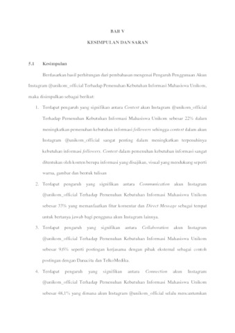 Penelitian ini bertujuan untuk mengetahui sejauhmana pengaruh akun Instagram @unikom_official terhadap pemenuhan kebutuhan informasi mahasiswa Unikom. Untuk menjawab permasalahan tersebut, peneliti menganalisa context, communication, collaboration, connection terhadap kebutuhan informasi terbaru, kebutuhan informasi rutin, kebutuhan informasi akurat, dan kebutuhan informasi sekilas. Pendekatan yang digunakan dalam penelitian ini yaitu penelitian kuantitatif dengan metode deskriptif serta menggunakan teknik analisis regresi linier sederhana. Populasi penelitian ini berjumlah 22,924 orang dengan menggunakan Simple Random Sampling maka diperoleh sampel penelitian sejumlah 100 orang. Hasil penelitian ini menunjukkan bahwa adanya pengaruh yang signifikan antara Akun Instagram @unikom_official terhadap pemenuhan kebutuhan informasi mahasiswa Unikom sebesar 47,4%. Kesimpulan pada penelitian ini yaitu terdapat pengaruh yang signifikan antara Context dengan kebutuhan informasi sebesar 22%, Communication sebesar 33%, Collaboration sebesar 9,6%, Connection sebesar 48,1%. Current Need Approach sebesar 40,7%, Everyday Need Approach sebesar 28,7%, Exhaustic Need Approach sebesar 32,4%, Catching-Up Need Approach sebesar 28%. Hasil pengolahan data dan uji hipotesis mengatakan bahwa Ho ditolak dan Ha diterima. Saran untuk akun Instagram @unikom_official yaitu diharapkan dapat menjalin kerjasama lebih luas lagi dengan berbagai pihak eksternal agar dapat lebih dikenal lebih luas dengan melakukan promosi melalui akun Instagram @unikom_official serta lebih aktif dalam menyampaikan informasi yang relevan.