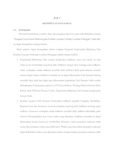 Hasil penelitian berdasarkan analisis deskriptif untuk seluruh variabel yang diteliti berada pada kategori baik. Hasil uji korelasi menunjukkan bahwa Experiential Marketing dan Kualitas Layanan memiliki hubungan sedang terhadap Loyalitas Pelanggan. Hasil uji hipotesis menyatakan bahwa adanya pengaruh Experiential Marketing dan Kualitas Layanan terhadap Loyalitas Pelanggan, baik secara parsial maupun simultan.
