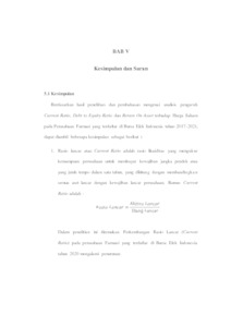 Bersumber dari hasil uji hipotesis bahwa Rasio Lancar memiliki pengaruh positif dan signifikan terhadap Harga Saham, Rasio Hutang memiliki pengaruh positif dan signifikan terhadap Harga Saham, Pengembalian Aset memiliki pengaruh negatif dan tidak signifikan terhadap Harga Saham. Ketiga veriabel tersebut secara simultan memiliki pergaruh positif dan tidak signifikan terhadap Harga Saham.